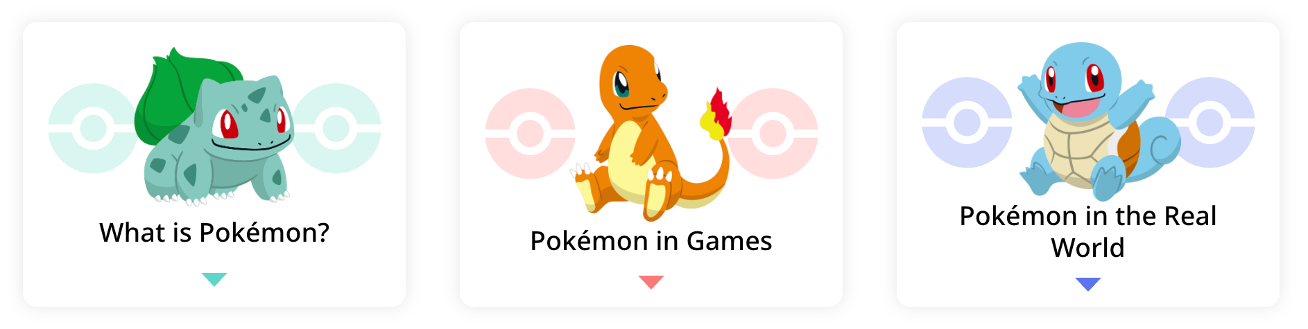 Looks like Bulbasaur, Charmander, and Squirtle are here to greet us! Click on each Pokémon to directly access each section of the page.